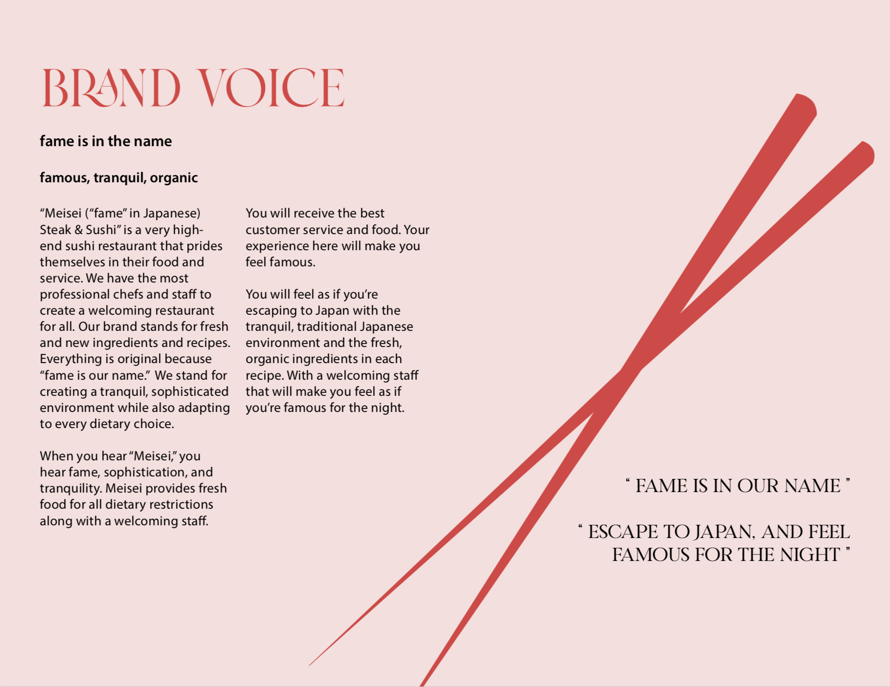 “Meisei (“fame” in Japanese) Steak & Sushi” is a very high-end sushi restaurant that prides themselves in their food and service. They offer great customer service along with the best organic ingredients in our food, so you don’t have to ever worry where the products come from. Meisei has the most professional chefs and staff to create a welcoming restaurant for all. When you hear “Meisei,” you hear fame, sophistication, and tranquility. Meisei provides fresh food for all dietary restrictions along with a welcoming staff. You will receive the best customer service and food. Your experience here will make you feel famous.